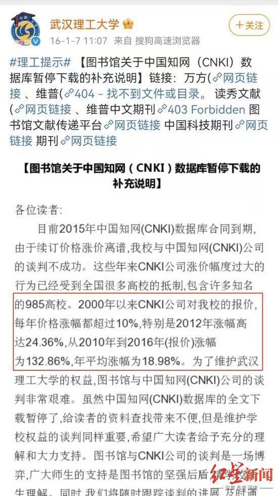 早在2016年1月7日,武汉理工大学曾在官方微博发布相关声明称,2015年中国知网数据库合同到期,由于续订价格离谱,其与中国知网(CNKI)公司的谈判不成功。