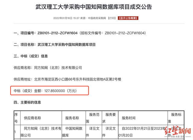 武汉理工大学2022年以127万元的价格采购知网数据库