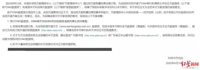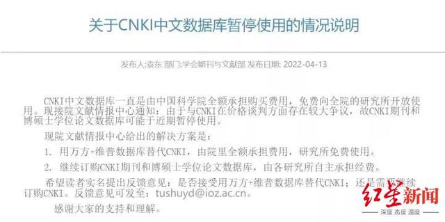 还有中科院内部人士告诉红星资本局,“全院对CNKI数据库的访问只持续到4月20日,之后仅对参团订购的研究所开通。”