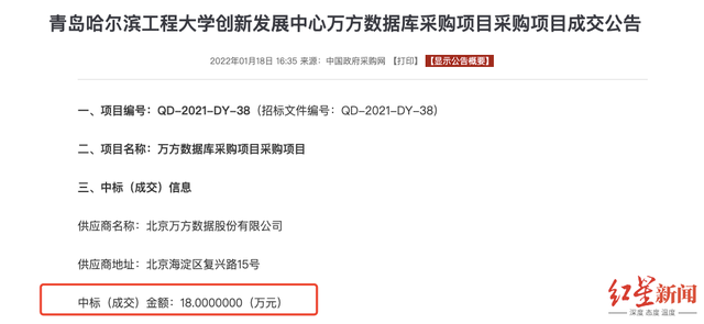 可以对比的是,万方数据库的采购价格要远低于中国知网。2月28日,西南民族大学采购万方数据库的金额是33.8万元;青岛哈尔滨工程大学创新发展中心采购万方数据库的金额是18万元。