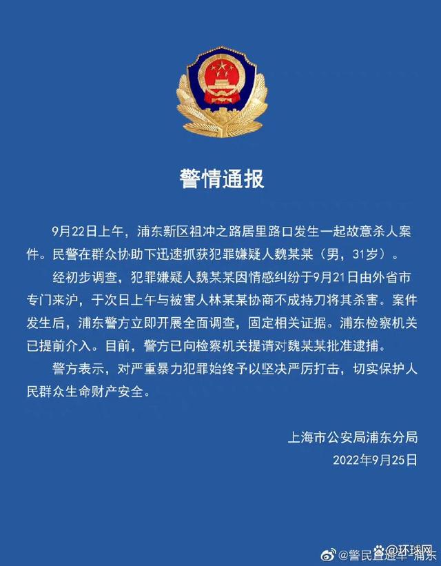 经初步调查,犯罪嫌疑人魏某某因情感纠纷于9月21日由外省市专门来沪,于次日上午与被害人林某某协商不成持刀将其杀害。案件发生后,浦东警方立即开展全面调查,固定相关证据。浦东检察机关已提前介入。目前,警方已向检察机关提请对魏某某批准逮捕。