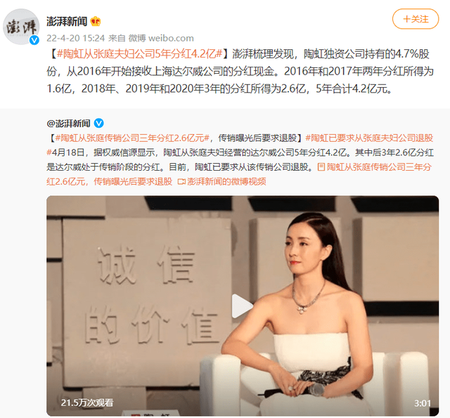 近日,据媒体报道,权威信源显示,陶虹从张庭夫妇经营的达尔威公司5年分红4.2亿,其中后3年2.6亿分红是达尔威处于传销阶段的分红。目前,陶虹已要求从该传销公司退股。
