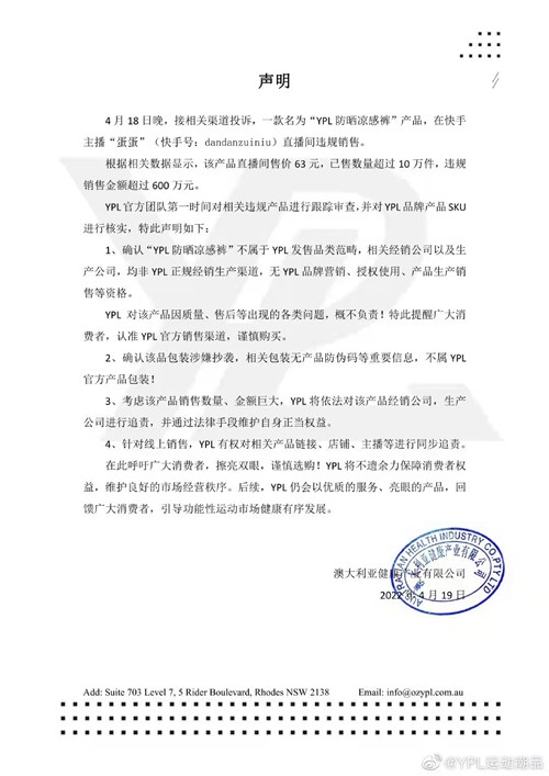 根据相关数据显示,该产品直播间售价63元,已售数量超过10万件,违规销售金额超过600万元。YPL表示,考虑该产品销售数量、金额巨大,YPL将依法对该产品经销公司,生产公司进行追责,并通过法律手段维护自身正当权益。同时,针对线上销售,YPL有权对相关产品链接、店铺、主播等进行同步追责。