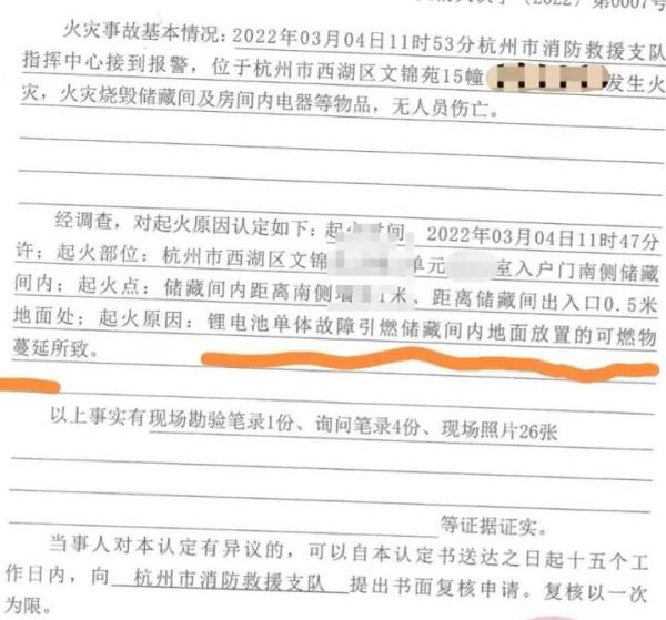 何女士向小时新闻记者提供了今年6月底消防部门出具的火灾事故认定书,显示:火灾由“锂电池单体故障引燃储藏间地面放置的可燃物蔓延所致”。
