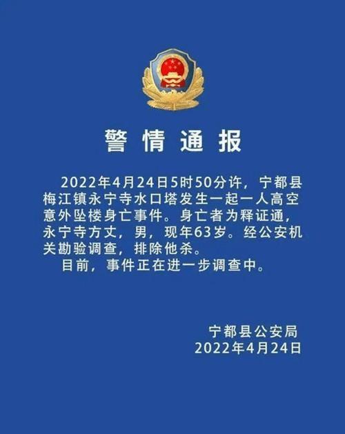 【江西一方丈坠楼身亡】4月24日,江西赣州。据宁都警方通报,永宁寺方丈释证通高空意外坠楼身亡,排除他杀。释证通系江西省佛教协会副会长,4天前还主持会议。目前,事件正在进一步调查中。