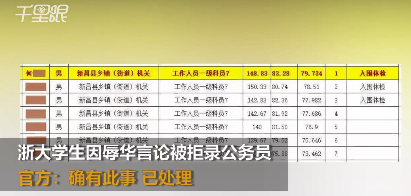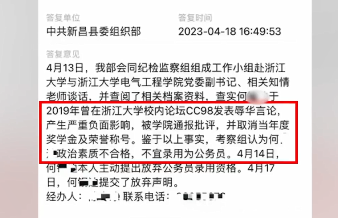 4月20日,浙江绍兴。有网友发视频称浙江大学有学生在报考公务员时被举报,揭露其在上学期间在学校内部论坛发表辱华言论。接到举报后中共新昌县委组织部到浙江大学查实情况,考察组认为其政治素质不合格,不宜录用为公务员。21日,新昌县中共县委组织部工作人员称,确有此事,已经处理,目前该生已主动放弃名额。若该生不放弃名额,则会按规定做出处理,后期不会对此事做出通报。