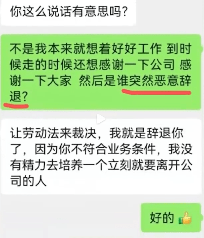 据聊天记录截图显示,当事人表示自己本来还想着好好工作,走的时候感谢一下公司,感谢一下大家,现在没想到突然被恶意辞退。