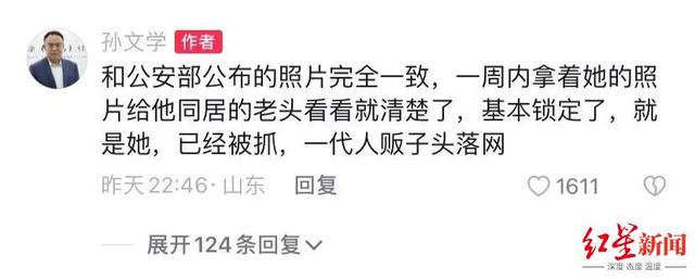 4月25日晚,北京国标(青岛)律师事务所律师孙文学在其短视频账号上发帖称,传言中涉嫌参与数起儿童拐卖案的“梅姨”已落网。“和公安部公布的照片完全一致,一周内拿着她的照片给她同居的老头看看就清楚了”。4月26日,孙文学又发布了一组照片,称其中一张彩色照片或为“梅姨”近照。
