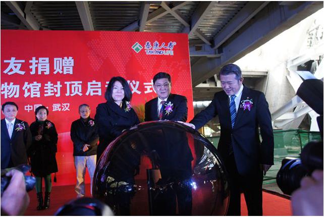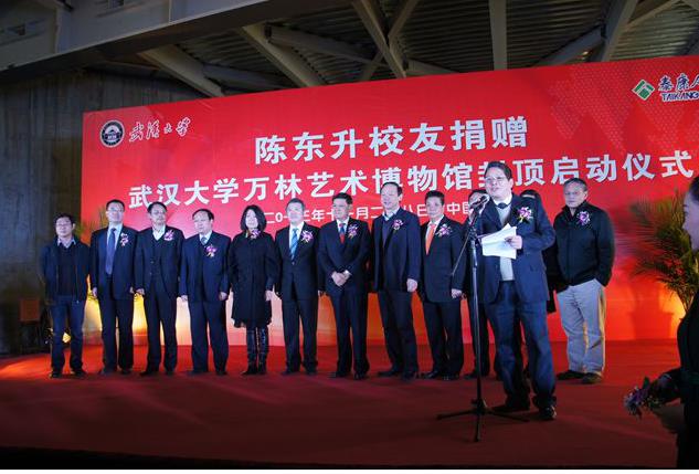 值武汉大学120周年校庆之际,11月28日,武汉大学万林艺术博物馆喜封金顶。杰出校友、艺术馆捐赠人陈东升及夫人孔东梅,校友毛振华、艾路明、喻杉、周旭洲、刘卫国、陈华元等武大毕业优秀企业家,校长李晓红,副校长谈广鸣、谢红星等出席封顶仪式。