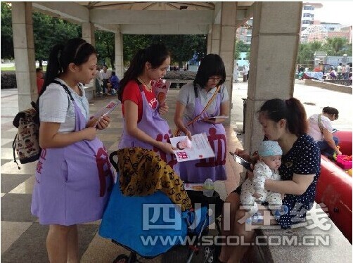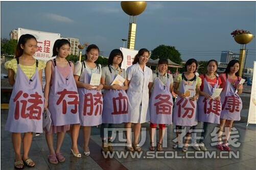 四川在线(记者杨晓江)8月28日,十多位省脐带血造血干细胞库的志愿者身着孕妇装,扮作“准妈妈”走上街头开展公益宣传活动,号召准妈妈们捐献脐带血,献出爱心,这也是省脐血库首次在南充进行公益宣传活动。