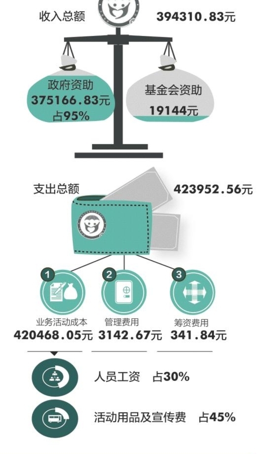 东莞市天使家园公益服务中心近日“晒”出机构去年的账本。记者了解到,去年“天使家园”收入达394310.83元,支出为423952.56元,结余为-29641.73元,如果加上两个项目今年才到账的“尾款”,去年该机构基本收支平衡。此外,在收入方面,“天使家园”约95%收入来自政府资助。