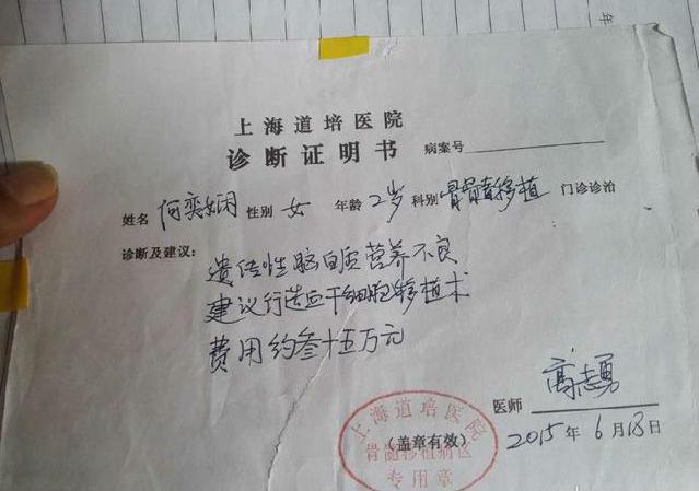 何坤泽介绍,女儿的病情确诊后,他曾经联系到一名患同样疾病的患者家庭,根据病友介绍,他在上海一家私立医院获悉,“医生说,我女儿的病可以治,就是通过骨髓移植,但花费至少需要35万元。”何坤泽拿出一张盖有公章的“证明书”,其中上海这家医院的一名医生介绍了何奕娴的病情和治疗手段,并注明骨髓移植需要花费的金额,需要35万元。