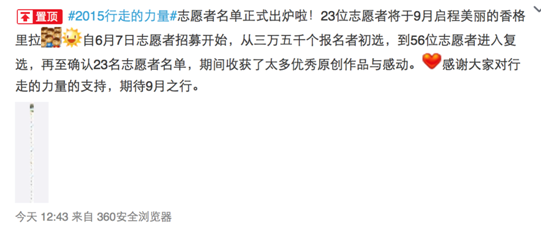 自6月7日,荣耀星伙伴陈坤发起的心灵建设公益项目“2015行走的力量”在京宣布正式启动后,行走的力量便一直深受各方关注。8月5日,2015行走的力量志愿者名单最终出炉,从三万五千多个报名者最终选出23位志愿者,他们将随着陈坤一起,于9月初勇敢踏上行走之路,荣耀品牌也一路见证着行走志愿者的荣耀之路。