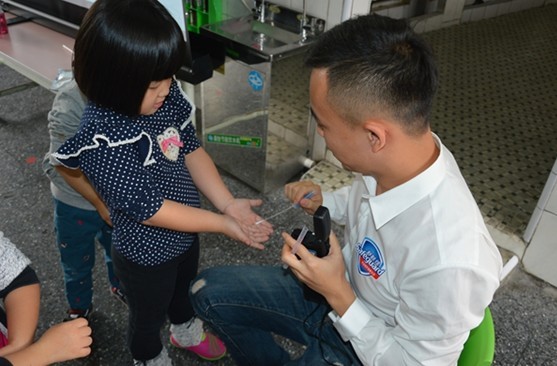东莞站课堂演示中,舒肤佳工作人员用细菌检测仪帮孩子检测手部细菌。直观的体验让孩子对细菌危害及其踪迹印象十分深刻。这种“学、行”结合的教育方法备受嘉荣“健康大使”、教研组一行和家长们的好评。
