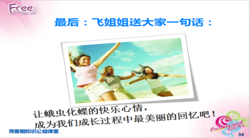 讲座的重点主要从青春期生理现象和自我保护两个方面进行演说。青春期是身体发育的第二高峰,生理和心理都发生剧变,女生的具体表现在生理上生殖器官的发育并且出现月经的现象以及月经期的保健措施,心理上表现在对异性表现出对异性的关注,这段敏感的人生阶段,需要我们进行正确的指引。