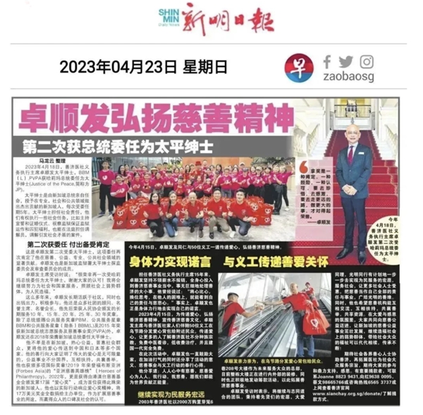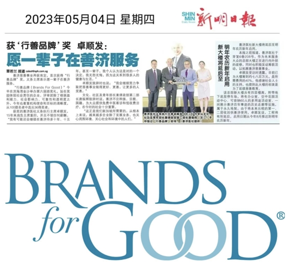 2023年5月4日早晨,“行善品牌(Brands For Good)”在滨海湾金沙举办第六届颁奖礼,这个奖项是卓顺发太平绅士所领导的善济医社获得,并在新明日报刊登了《获‘行善品牌’奖 卓顺发:愿一辈子在善济服务》的报道。