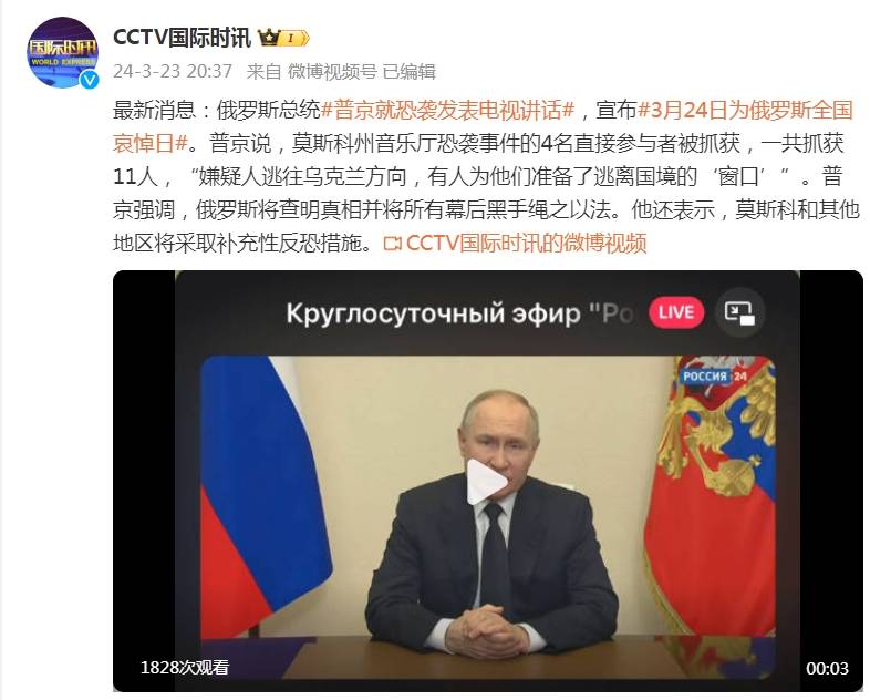 最新消息:俄罗斯总统普京就恐袭发表电视讲话,宣布3月24日为俄罗斯全国哀悼日。普京说,莫斯科州音乐厅恐袭事件的4名直接参与者被抓获,一共抓获11人,“嫌疑人逃往乌克兰方向,有人为他们准备了逃离国境的‘窗口’”。普京强调,俄罗斯将查明真相并将所有幕后黑手绳之以法。他还表示,莫斯科和其他地区将采取补充性反恐措施。