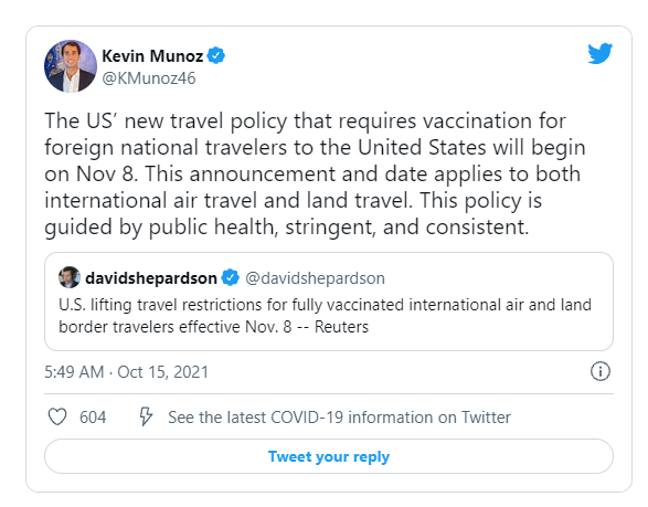根据报道,美国白宫新闻秘书助理凯文·穆尼奥斯(Kevin Munoz)在社交媒体上发布公告称,美国新的旅行政策将于11月8日开始实施,该政策将取消对完全接种新冠疫苗的外国旅客的入境限制,此公告与日期适用于国际航空旅行和陆路旅行。