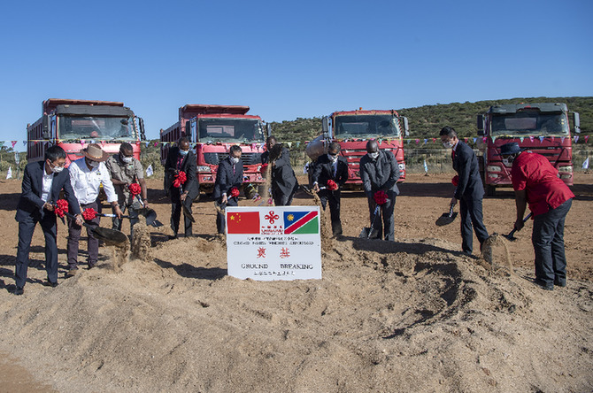 这是5月9日在纳米比亚首都温得和克拍摄的纳米比亚首都国际机场公路项目第三期工程开工仪式。(来源: 经济参考报)