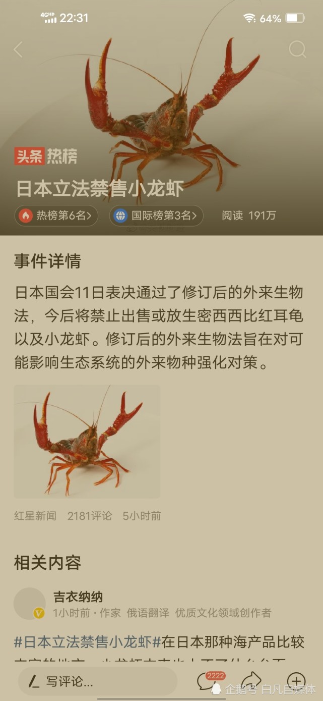 日本立法禁售小龙虾#小龙虾确实有很强的繁殖能力。如果任其发展,本土生物可能会受到很大影响,也会对整个国家的生态产生影响。
