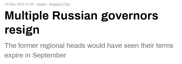 据今日俄罗斯电视台网站10日报道,五位俄罗斯州长级地方长官当天宣布辞职。这五人的任期都将在今年 9 月 11 日(俄罗斯2022年全国投票日)举行的地区选举之前到期。