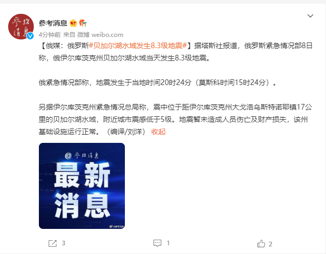 据塔斯社报道,俄罗斯紧急情况部8日称,俄伊尔库茨克州贝加尔湖水域当天发生8.3级地震。