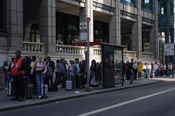 6月21日,人们在英国伦敦街头等待搭乘公共汽车。