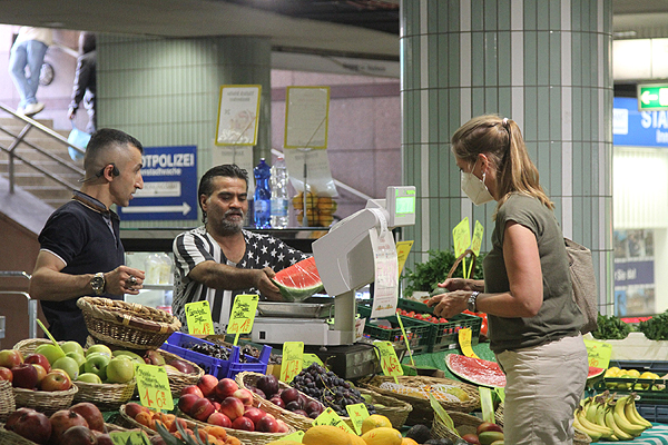8月2日,顾客在德国法兰克福一家摊位前购买水果。(来源: 经济参考报)