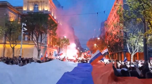 据RT报道,15日晚,抗议者游行穿过贝尔格莱德市中心一路走到俄罗斯大使馆前,现场高呼“塞尔维亚人和俄罗斯人——永远的兄弟!”“科索沃是塞尔维亚的,克里米亚是俄罗斯的!”不少人手中持塞尔维亚国旗、俄罗斯国旗,还有人展开了20米长的三色旗,RT称,该旗从一个角度看像俄罗斯国旗,而另一角度像是去掉了官方盾徽的塞尔维亚国旗。