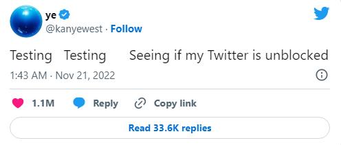 此外,近段时间以来,“侃爷”还因涉嫌反犹言论陷入争议,被推特、Instagram等多家社交媒体禁言。不过,据美国哥伦比亚广播公司(CBS)11月20日最新报道,韦斯特于当天“重返推特”,他本人也在当天发了条测试是否已被解禁的推特:“测试。测试。看看我的推特账号是否已经解除屏蔽了。”