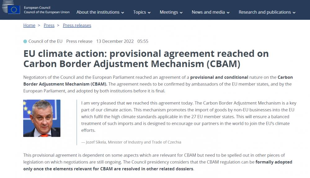 欧洲理事会官网周二通报,理事会与欧洲议会就欧盟碳边境调节机制(CBAM,一般称为欧盟碳关税)达成了一项临时且附条件的协议。