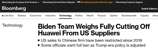报道称,美国一些官员向拜登政府提出了这一建议,若这项政策获得通过,所有美国供应商向华为供货的许可证申请都将被拒绝。知情人士称,这项政策还处于早期讨论阶段,有可能在今年5月获得通过,即美国将华为加入“实体清单”四周年之时。