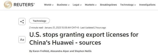 路透社报道称,有3名知情人士称,美国政府已停止向美国企业发放向华为出口产品的供货许可证,包括5G级别以下的物品,如4G、Wifi 6和Wifi 7、人工智能以及高性能计算和云项目。对此美国商务部发言人仅表示,将“不断评估我们的政策和法规”,而英特尔和高通都拒绝置评。