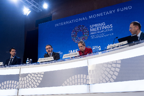4月11日,在美国华盛顿,国际货币基金组织(IMF)经济顾问兼研究部主任皮埃尔-奥利维耶·古兰沙(左二)出席新闻发布会。