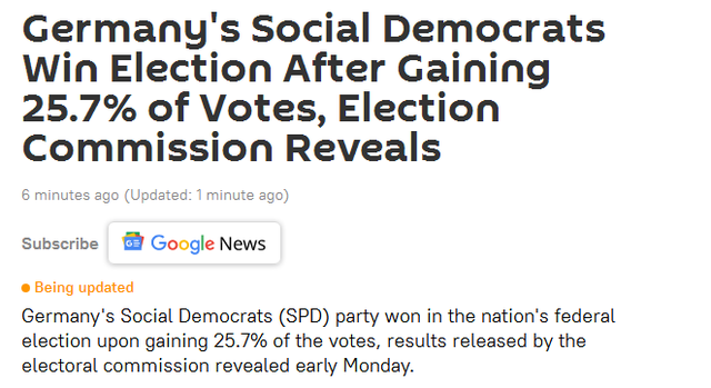 俄罗斯卫星网刚刚消息,德国联邦选举委员会在计算所有选区的结果后宣布,社民党以25.7%的得票率赢得联邦议院选举,联盟党以24.1%的得票率位居第二。