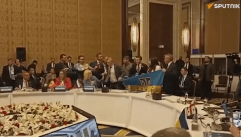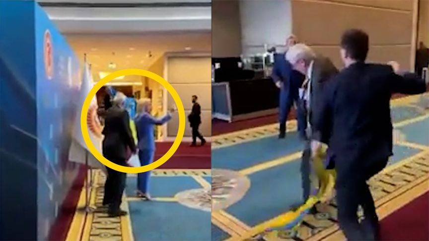 据媒体报道,5月4日,在土耳其安卡拉的一次会议上, 乌代表拿出国旗捣乱挑衅俄代表发言,俄代表见状随即夺走该人手中的国旗,乌代表随后暴怒动手,追着俄代表打,两人扭打在一起,全场乱成一团。随后,现场的工作人员不得不进场拉架,赶过去制止,混乱的局面才得到控制。