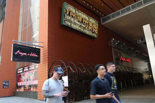 5月29日,人们经过美国纽约曼哈顿的“国债钟”。“国债钟”是一个大型计数器,它实时更新美国的公共债务总额,并显示出每个美国家庭所要负担的数额。美国总统拜登28日晚对媒体表示,已与众议院共和党籍议长麦卡锡就提高联邦政府债务上限达成最终协议,并正将该协议提交给国会两院投票。