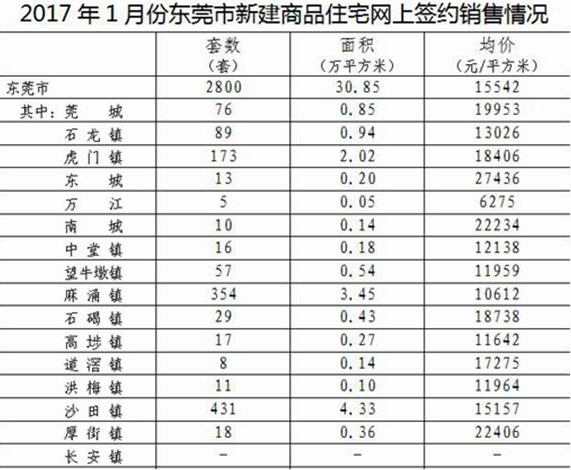 2017年1月东莞一手房成交价持续稳定 今天(2月16日),东莞市统计局发布2017年1月东莞新建商品住宅网上签约销售情况。数据显示,新年伊始,东莞一手房...