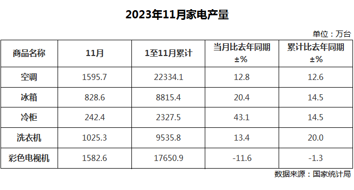 国家统计局数据显示,2023年11月全国空调产量1595.7万台,同比增长12.8%;1-11月累计产量22334.1万台,同比增长12.6%。
