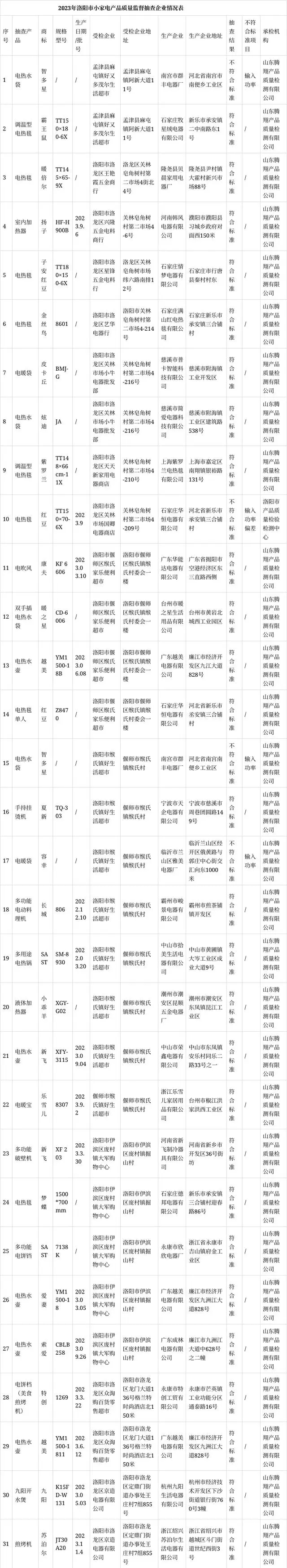 根据《洛阳市市场监督管理局关于下达<2023年洛阳市产品质量监督抽查计划>的通知》(洛市监〔2023〕2号)的通知要求,河南省洛阳市市场监督管理局2023年在全市组织开展了流通领域小家电、服装、成品油产品质量监督抽查。其中,抽查小家电31个批次,4个批次不合格。