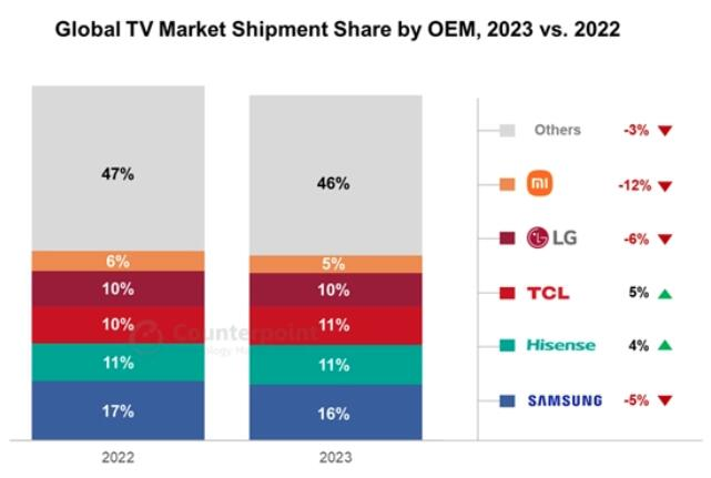 TCL以同样11%的市场份额位居第三,其2023年出货量同比增长了5%,海信和TCL也成为排名前5中唯二增长的厂商。