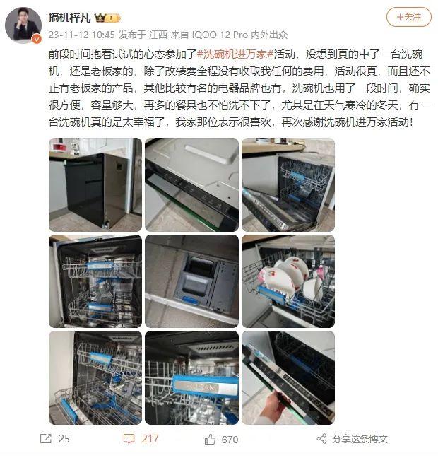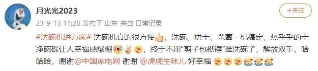 好在科技给了人类选择,借助洗碗机可以让洗锅洗碗的一地鸡毛变得秩序井然。洗碗机进万家中奖用户赵女士分享:“洗碗机很大程度上解放了双手,把餐具放进洗碗机后,就可以去做别的事情了,不仅省出了不少时间,也摆脱了我们洗碗时的油污。” 来自吉林的刘女士表示,洗碗机不仅是解放双手的神器,还能解决家庭纠纷,“这下不用跟老公吵架谁刷碗了”。获得爱豆代言产品的后王女士则直呼自己太幸运,要解锁洗碗机更多功能。