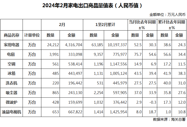 海关总署数据显示,2024年2月中国出口家用电器24,212万台,同比增长52.5%;1-2月累计出口63,185万台,同比增长38.6%。