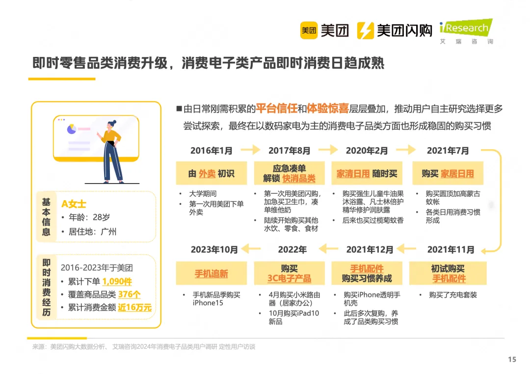 美团闪购在3C家电品类的即时零售探索为企业突破现有瓶颈提供了很好的解决方案。据《白皮书》显示,用户即时消费习惯已经养成,同时向全场景发展,走入日常生活方方面面。以《白皮书》中一位真实用户经历为例,这位广州的28岁女士,2016-2023年于美团累计下单1090件,覆盖商品品类376个,累计消费金额近16万元,个例背后是美团闪购千千万万这样的用户,都是3C家电品类待挖掘的用户群体。