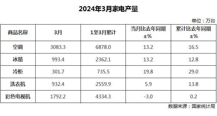 国家统计局数据显示,2024年3月全国空调产量3083.3万台,同比增长13.2%;1-3月累计产量6878.0万台,同比增长16.5%。