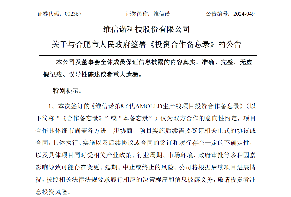 5月28日,维信诺科技股份有限公司发布其与合肥市人民政府签署《投资合作备忘录》公告,拟在安徽省合肥市投资建设第8.6代柔性有源矩阵有机发光显示器件(AMOLED)生产线项目,玻璃基板尺寸为 2290 mm×2620 mm ,设计产能 32K/月,投资总额预计为人民币550亿元。