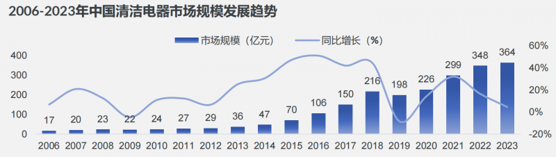 其中,近年来清洁电器市场持续增长。《白皮书》指出,当前清洁电器在整体家电市场规模中位居第六,在小家电市场中占据规模TOP1。GfK中怡康测算数据显示,2006年到2023年期间,清洁电器复合增长率高达19.8%,市场规模扩大近21倍至364亿元。
