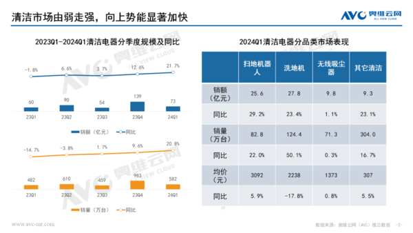 这使得用户对于家用清洁类产品的需求持续释放。根据奥维云网数据显示,2024 年第一季度,清洁电器销售额同比增长 21.7%,销量同比增长 20.8%。其中扫地机器人销售额同比增长 29.2%,销量同比增长 22%。