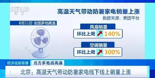 电商平台数据显示,近一周,风扇、空调等制冷电器搜索量环比上周增长3倍;6月11日全国多地高温,平台上家电商家的风扇销量环比上周增长140%、空调销量增长300%。