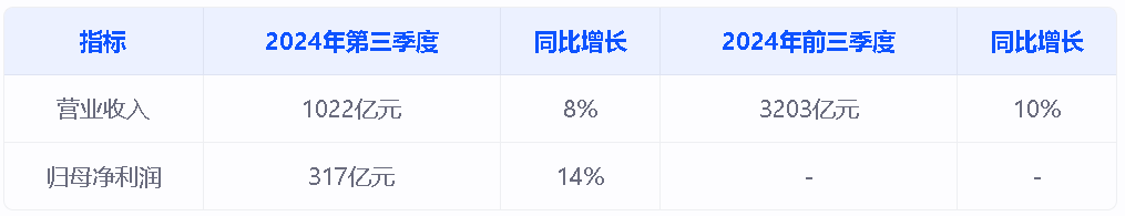 2024年10月30日晚,美的集团发布了令人瞩目的2024年第三季度报告,显示公司业绩再创新高。第三季度实现营业收入1022亿元,同比增长8%;前三季度营业收入3203亿元,同比增长高达10%,归母净利润达到317亿元,同比增长14%。